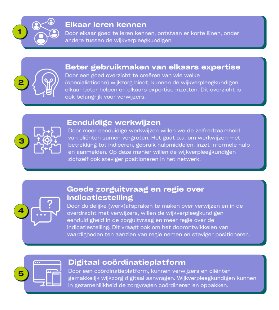 Met elkaar werken wij aan herkenbare en aanspreekbare wijkzorg. Dit houdt in dat inwoners en alle zorgprofessionals in de provincie Groningen de wijkzorg goed kunnen vinden en weten waarvoor ze bij wijkzorg terecht kunnen. Het betekent ook dat wij samen met huisartsen, ziekenhuizen en hulp- en welzijnsorganisaties er verantwoordelijk voor zijn dat alle inwoners met een zorgvraag de juiste zorg en ondersteuning krijgen.